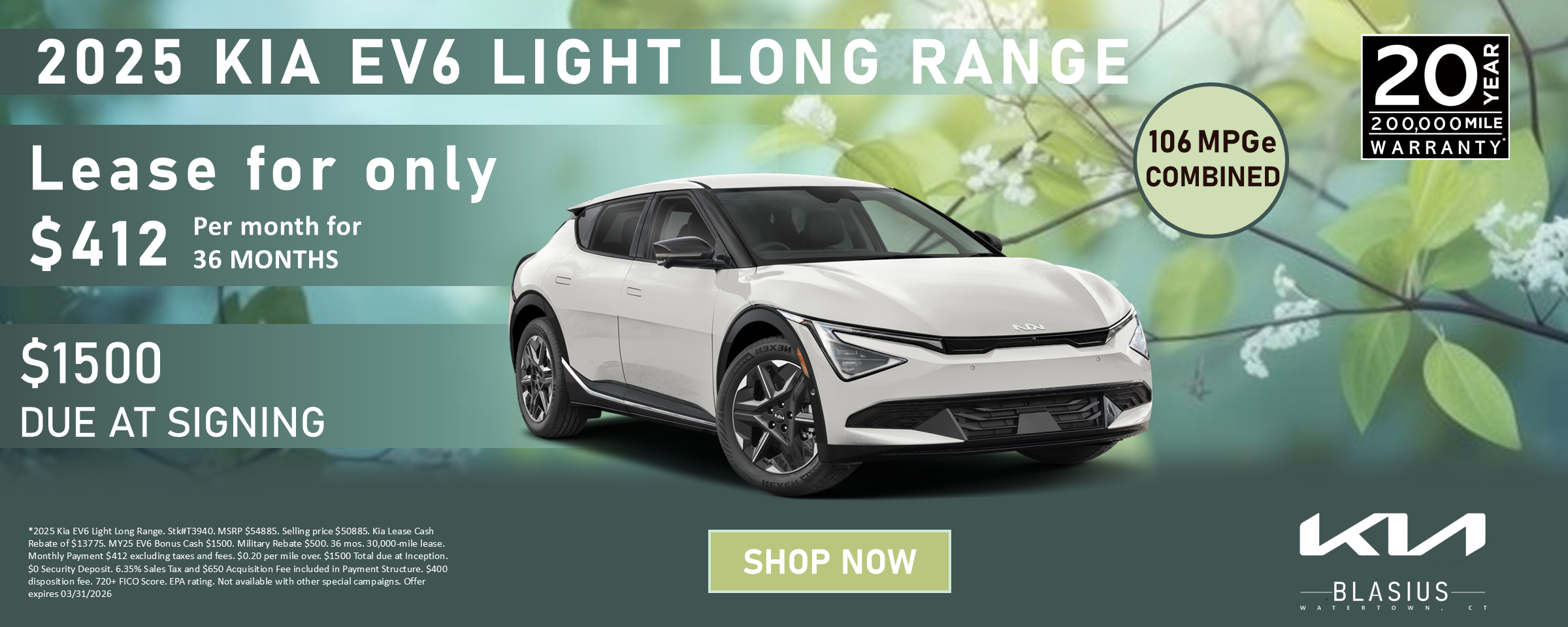 *2025 Kia EV6 Light Long Range. Stk#T3940. MSRP $54885. Selling price $50885. Kia Lease Cash Rebate of $13775. MY25 EV6 Bonus Cash $1500. Military Rebate $500. 36 mos. 30,000-mile lease. Monthly Payment $412 excluding taxes and fees. $0.20 per mile over. $1500 Total due at Inception. $0 Security Deposit. 6.35% Sales Tax and $650 Acquisition Fee included in Payment Structure. $400 disposition fee. 720+ FICO Score. EPA rating. Not available with other special campaigns. Offer expires 03/31/2026