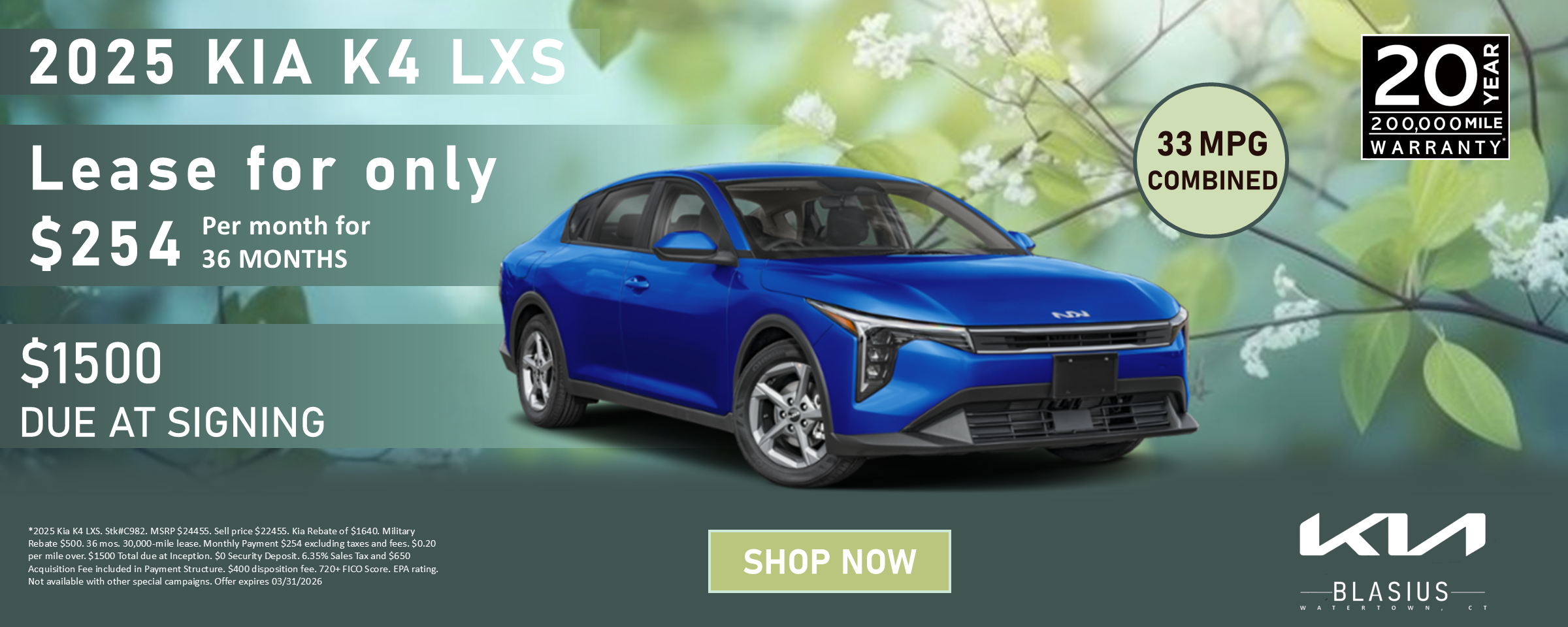 *2025 Kia K4 LXS. Stk#C982. MSRP $24455. Sell price $22455. Kia Rebate of $1640. Military Rebate $500. 36 mos. 30,000-mile lease. Monthly Payment $254 excluding taxes and fees. $0.20 per mile over. $1500 Total due at Inception. $0 Security Deposit. 6.35% Sales Tax and $650 Acquisition Fee included in Payment Structure. $400 disposition fee. 720+ FICO Score. EPA rating. Not available with other special campaigns. Offer expires 03/31/2026